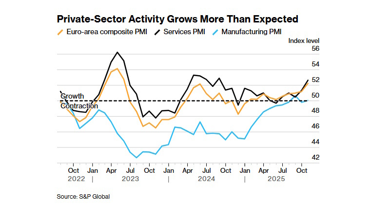 Indicele compozit al managerilor de achiziții (PMI), calculat de S&P Global, a crescut la 52,2 în octombrie, de la 51,2 în septembrie, îndepărtându-se și mai mult de pragul de 50 care separă creșterea de contracție.