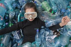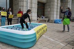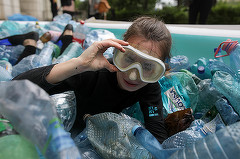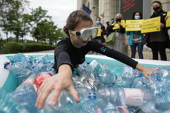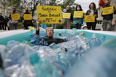 FOTO Protest în fața Ministerului Mediului cu piscină, PET-uri și "scafandri"