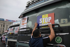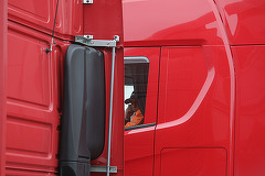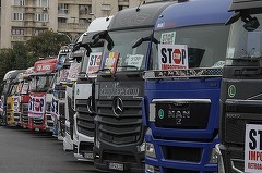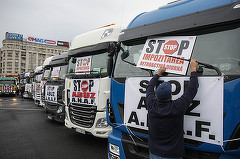 Câteva zeci de camioane aparținând a trei asociații patronale ale transportatorilor rutieri sunt parcate, miercuri dimineață, în Piața Victoriei, în cadrul unui miting de protest al transportatorilor față de politica Guvernului de impozitare a diurnei șoferilor de transport de marfă, dar și față de prețurile asigurărilor obligatorii auto și de carantinarea șoferilor.