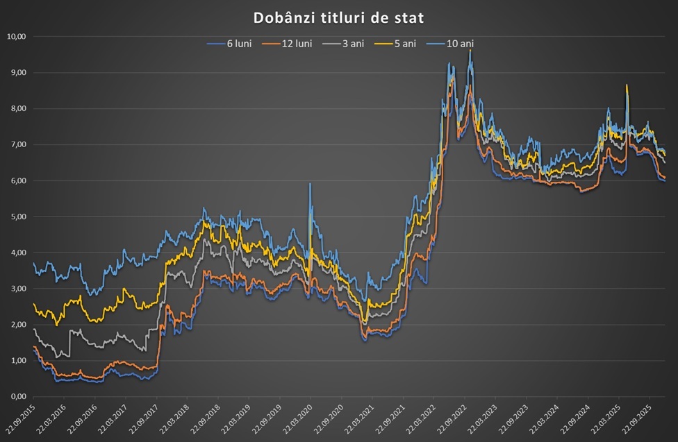 Randamentul la 10 ani a scăzut de la un vârf de 8,44% în mai, la 6,78% luni. O scădere mai accentuată a randamentelor se observă începând cu luna octombrie. Nivelul curent este cel mai redus de după octombrie 2024, înainte de vâltoarea electorală. Instabilitatea politică izvorâtă din rezultatul primului tur al alegerilor prezidențiale reluate a dus la ieșiri mari de capitaluri și creșterea abruptă a costurilor de împrumut.