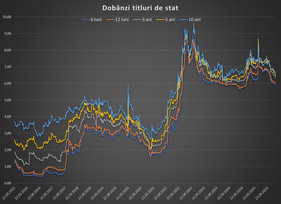Față de finele lui 2025, randamentul mediu la titlurile pe 10 ani din piața secundară a scăzut cu 12 puncte de bază, la 6,6%. Scăderea randamentelor se înscrie într-o tendință regională.