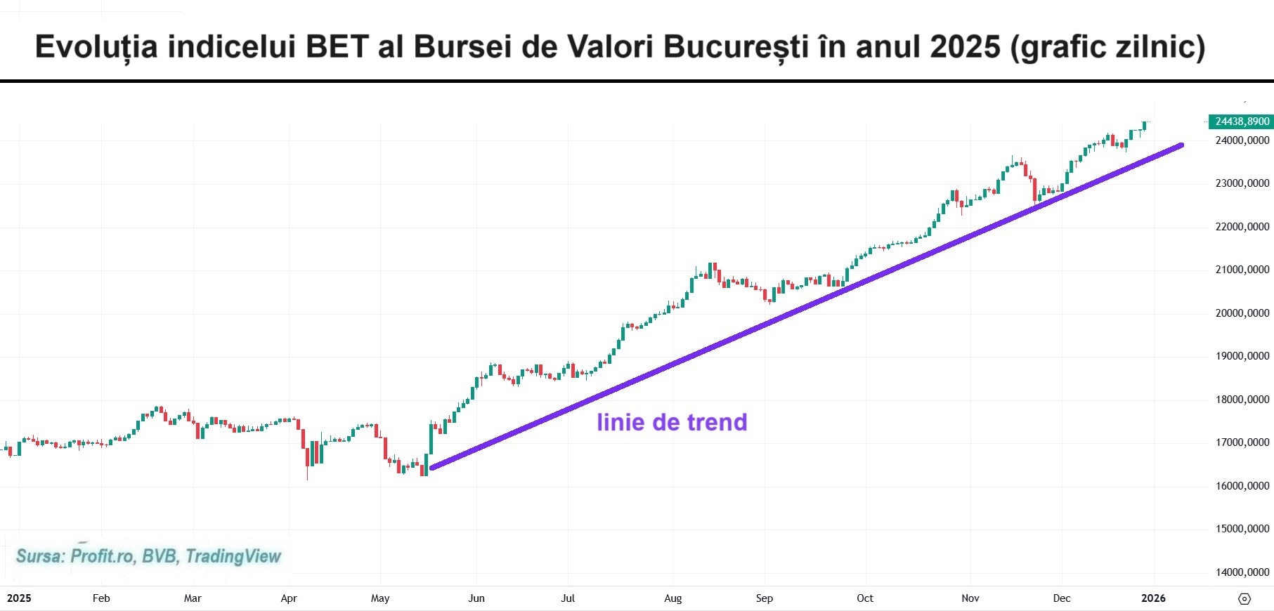 Indicele reprezentativ BET a urcat cu 0,72%, până la un nou maxim istoric de 24.438,89 de puncte, care este cu 46,16% peste ultima valoare de tranzacționare a anului 2024. Este o performanță anuală puțin scontată chiar de profesioniștii de piață, având în Vedere contextual macroeconomic slab și faptul că bursa românească venea după alți ani de creșteri semnificative.