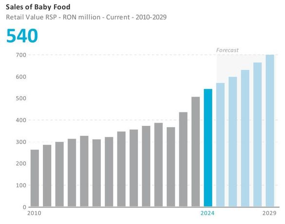 Vânzările din România, în retail și la prețul recomandat de producători, de hrană pentru bebeluși vor fi în 2024 de 540 de milioane de lei, în creștere cu 7% comparativ cu 2023, potrivit raportului „Baby Food in Romania”, realizat de Euromonitor.