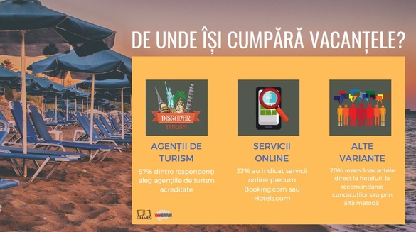 Întrebați de unde își cumpără bilete de vacanță, 57% au declarat că de la agențiile de turism acreditate, 23% au indicat servicii online precum Booking.com sau Hotels.com, iar restul au menționat alte forme de rezervare.
