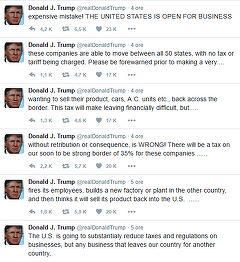 Președintele ales al SUA, Donald Trump, amenință că va penaliza drastic companiile americane care își mută operațiunile în alte state, unde cheltuielile cu forța de muncă sunt mult mai reduse. Printre măsurile retaliatorii avute în vedere s-ar numără și o taxă vamală uriașă, de 35%, pentru produsele reexportate în Statele Unite de aceste companii.