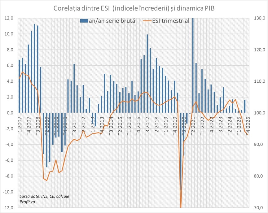 „Am observat o reacție exagerată în cifrele ESI în 2025, legată de agitația politică și de măsurile de consolidare fiscală, în special din partea consumatorilor. Datele privind PIB-ul au arătat un răspuns economic mai moderat”, notează Vlad Ioniță, economist la Banca Comercială Română.