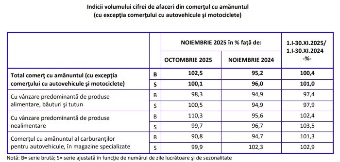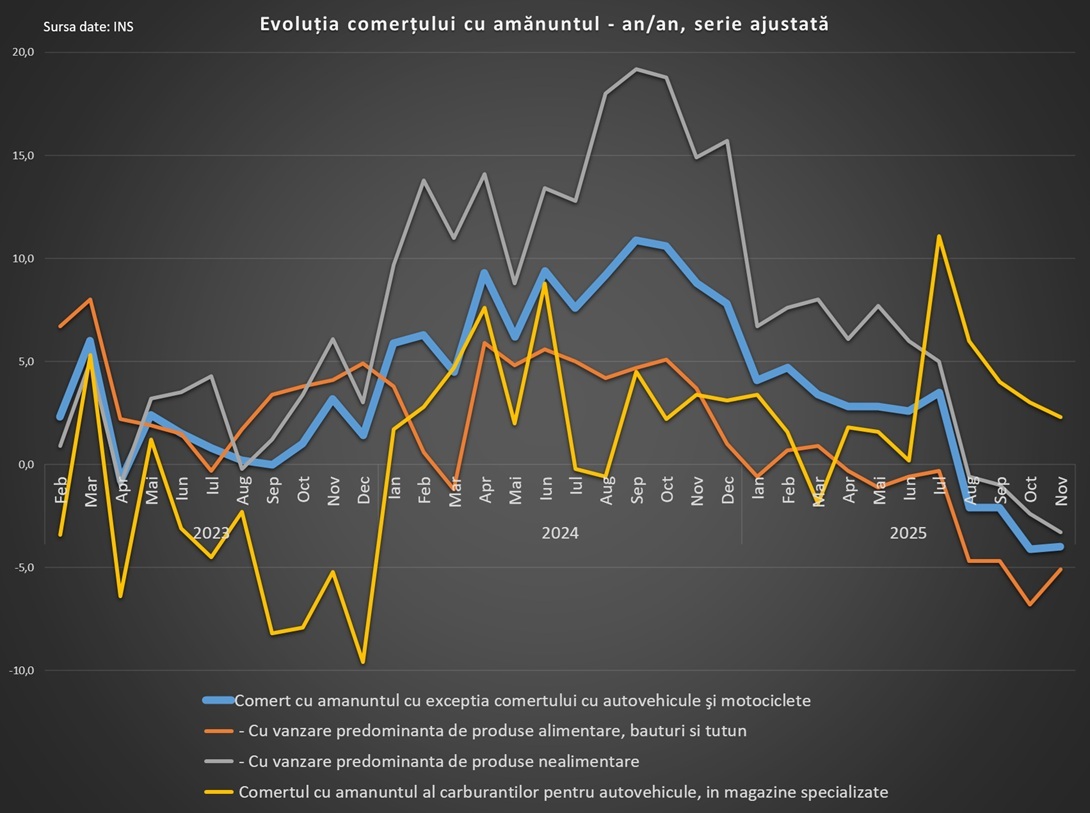În noiembrie anul curent, seria ajustată arată scăderi anuale de 5,1% la vânzările de alimente, 4,4% la produsele nealimentare și o creștere de 2,3% la carburanți.