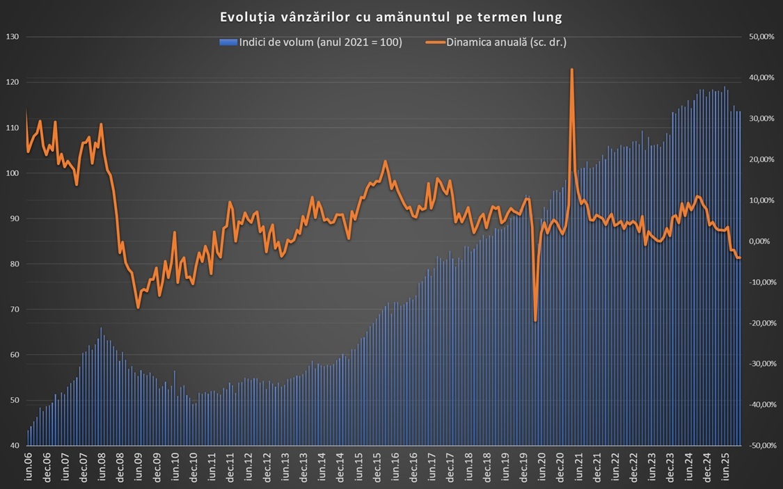 Spre comparație, în noiembrie 2024, când deficitul ridicat alimenta încă consumul, salariile creșteau cu două cifre și nu se discutau încă măsuri de austeritate – fiind campanie electorală – vânzările creșteau cu aproape 9% în termeni anuali.