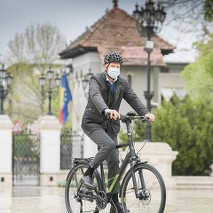 Președintele Klaus Iohannis merge cu bicicleta la Palatul Cotroceni, alăturându-se astfel campaniei Vinerea Verde, care încurajează utilizarea transportului alternativ pentru deplasare.
