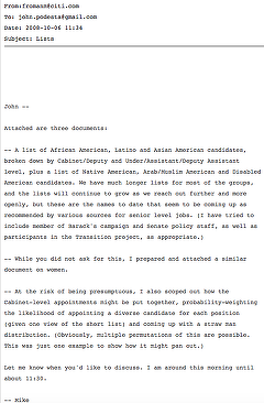 Un fost bancher și actual șef al Biroului pentru Comerț Exterior al SUA, Michael Froman, i-a trimis în octombrie 2008, cu o lună înainte de desfășurarea ultimelor alegeri prezidențiale, un mail șefului de campanie al actualului președinte Barak Obama, la acea oră candidat, care conținea practic componența viitorului executiv american. Wikileaks a publicat mail-ul bancherului, care are atașat un document cu propunerile acestuia, propuneri care, prin minune, s-au și materializat după câștigarea de către Obama a unui nou mandat.