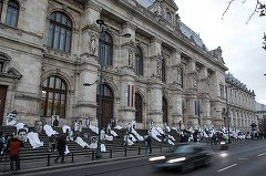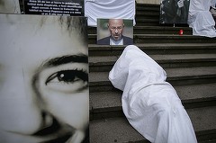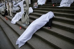 FOTO Șase ani de la incendiul din Colectiv - Oameni acoperiți cu bucăți de pânză albă, întinși pe treptele Curții de Apel București