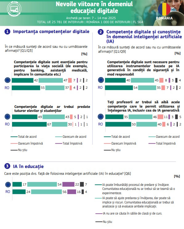 Graficele Comisiei Europene arată că românii sunt printre cei mai mari susținători ai introducerii competențelor digitale în educație la toate nivelurile, procentul răspunsurilor favorabile din România depășind media UE la toate categoriile.