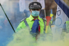 Polițiștii protestează din nou cu fumigene, în fața Ministerului de Interne, cerând demisia ministrului. Polițiștii scandează lozinci, fluieră și au intonat Imnul.