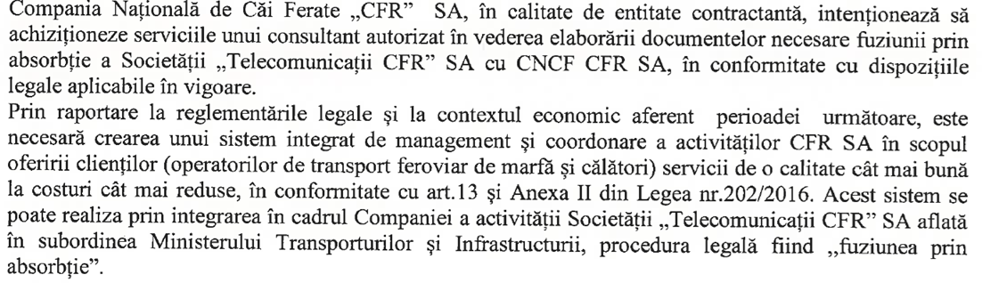 În acest sens, CFR SA va intenționează să achiziționeze serviciile unui consultant autorizat în vederea elaborării documentelor necesare fuziunii prin absorbție a Telecomunicații CFR.