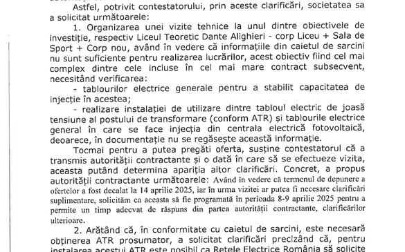 Licitația a fost contestată de compania de instalații electrice Energy Control Solutions SRL din Teleorman, un business cu rulaj anual de peste 20 milioane lei controlat de George Cristian Simion și Ramona-Irina Simion, potrivit termene.ro. Argumentul a fost că autoritatea contractantă nu a răspuns la solicitarea de clarificări a contestatorului în termenul prevăzut de legislația în vigoare (nerăspunzând deloc), ceea ce a împiedicat compania să formuleze și depună ofertă.