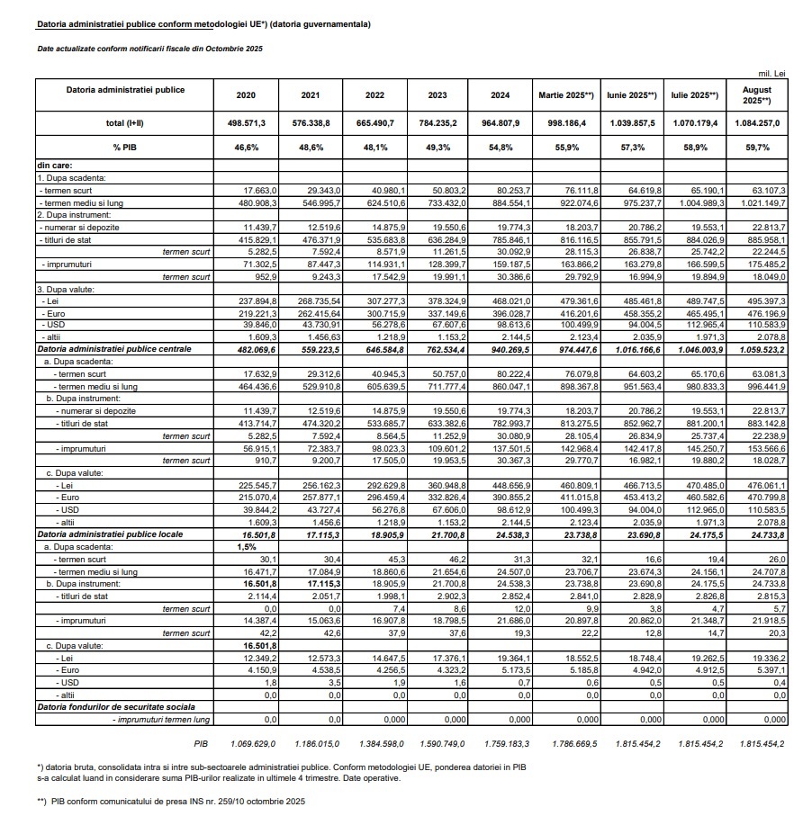 La final de 2024, datoria era de 964,4 miliarde lei (53,9% din PIB), iar la final de 2019, se situa la 372,9 miliarde lei (35% din PIB). Creșterea accelerată a datoriei este rezultatul deficitelor bugetare mari din ultimii ani, care au dus la situația dificilă din prezent a finanțelor publice.