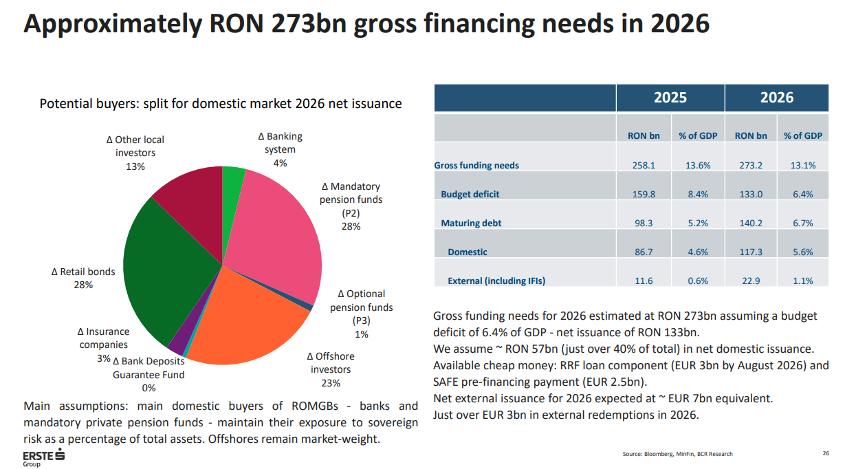 "Necesarul brut de finanțare pentru 2026 este estimat la 273 miliarde lei, presupunând un deficit bugetar de 6,4% din PIB - emisiune netă de 133 miliarde lei. Presupunem o emisiune internă netă de circa 57 miliarde lei (puțin peste 40% din total). Bani ieftini disponibili din componentă de împrumut PNRR de 3 miliarde euro până în august 2026 și plată de prefinanțare SAFE de 2,5 miliarde EUR. Emisiunea externă netă pentru 2026 este așteptată la aproximativ echivalentul a 7 miliarde euro. Puțin peste 3 miliarde euro sunt pe răscumpărări externe în 2026", au arătat economiștii Erste.