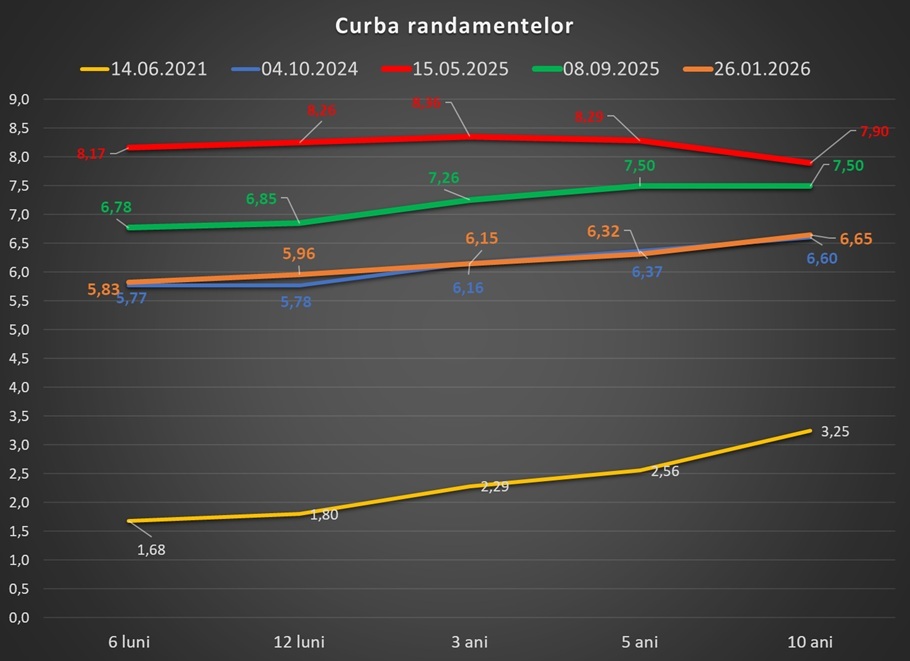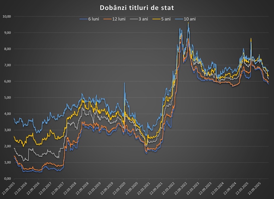 Dacă ne uităm la o perioadă mai îndelungată, randamentele la titlurile de stat în lei au scăzut cu circa 1 punct procentual față de septembrie și cu aproape 2 puncte față de vârfurile atinse imediat după primul tur al alegerilor prezidențiale din luna mai.