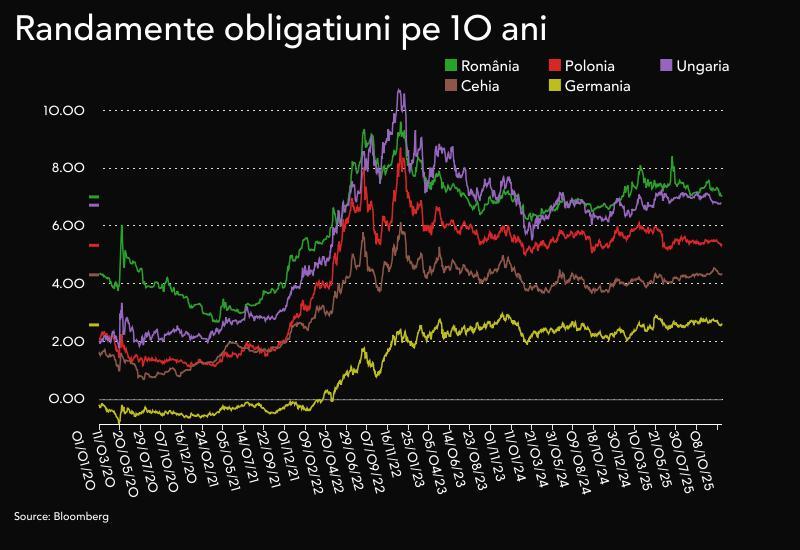 În piața secundară, randamentul la 10 ani a scăzut și la 7,02% pe an vineri, cel mai redus nivel de după noiembrie 2024. Rămâne în continuare cel mai ridicat din regiune, în condițiile Ungaria plătește ușor sub 6,8% pentru împrumuturile în monedă națională, Polonia plătește 5,3% și Cehia 4,4%.