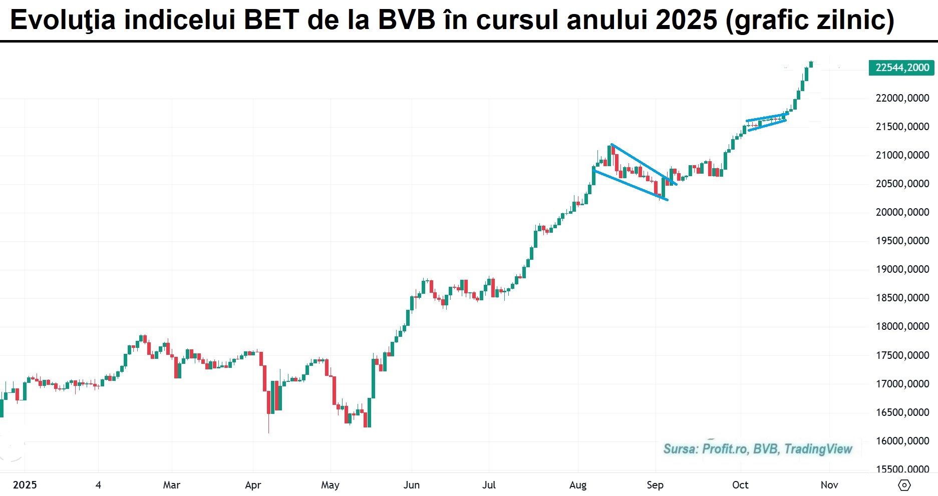 Acesta este contextul în care și la BVB cumpărătorii au reușit să împingă piața spre noi valori-record. Aprecierile au fost pe linie: +0,35% pentru indicele compozit BET-XT, +0,26% pentru indicele financiar BET-FI, care a închis la nivelul de 83.354,70 de puncte, +0,55% pentru indicele de energie BET-NG și +0,34% pentru indicele reprezentativ BET care, la nivelul de 22.621,53 de puncte, atinge un o nouă culme a bursei locale.