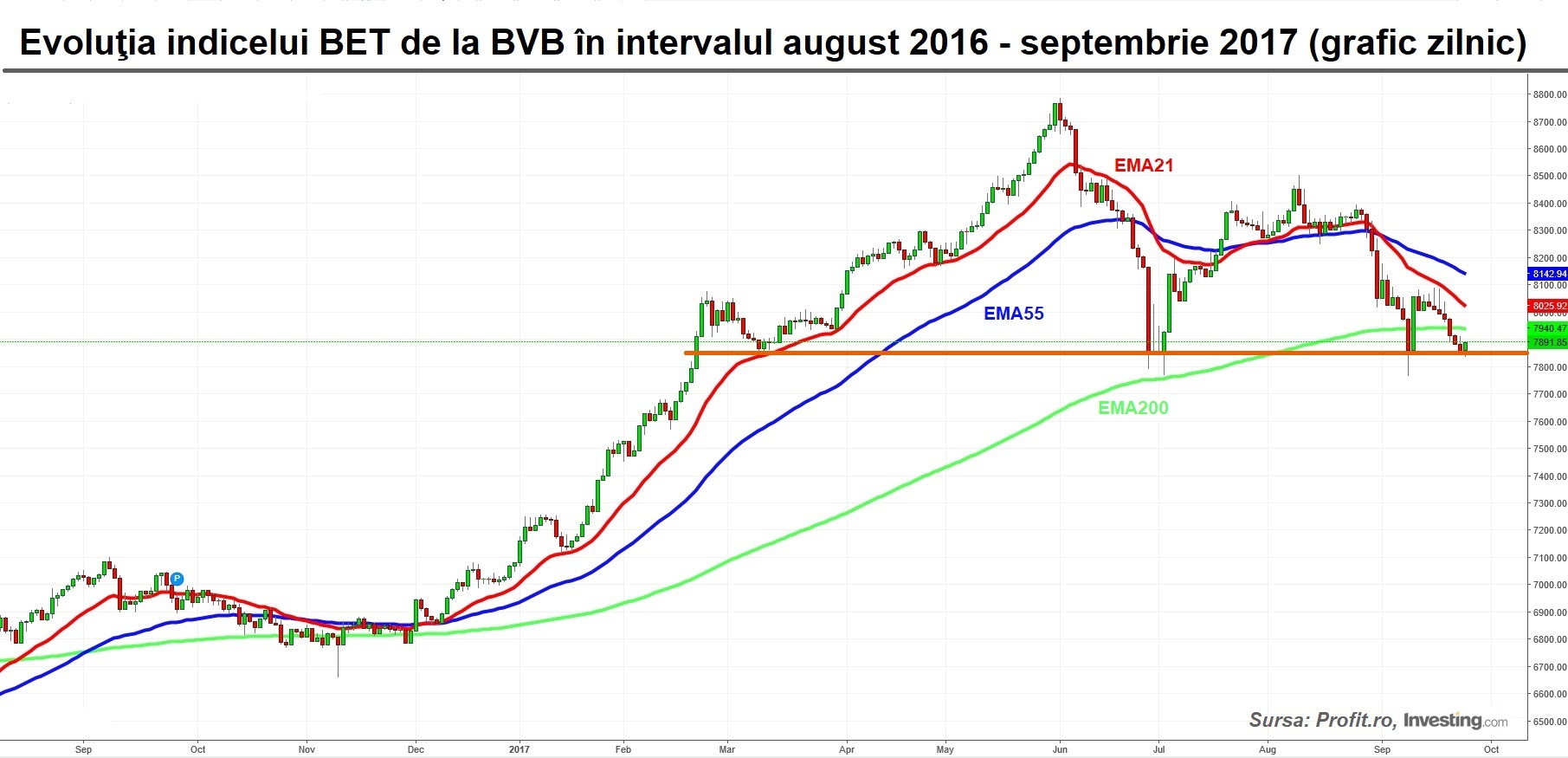 Indicele compozit BET Plus a avansat cu 0,47%, iar indicele reprezentativ BET a câștigat 0,52%, până la nivelul de 7.888,64 puncte. Este un ricoșeu dintr-o zonă în care cumpărătorii s-au regrupat nu numai în urmă cu 3 săptămâni, dar și în lunile martie și iulie, așa cum se vede pe graficul atașat. Cotația rămâne sub media mobilă exponențială de 200 de zile (EMA200) care definește trendul pe un termen mai extins.
