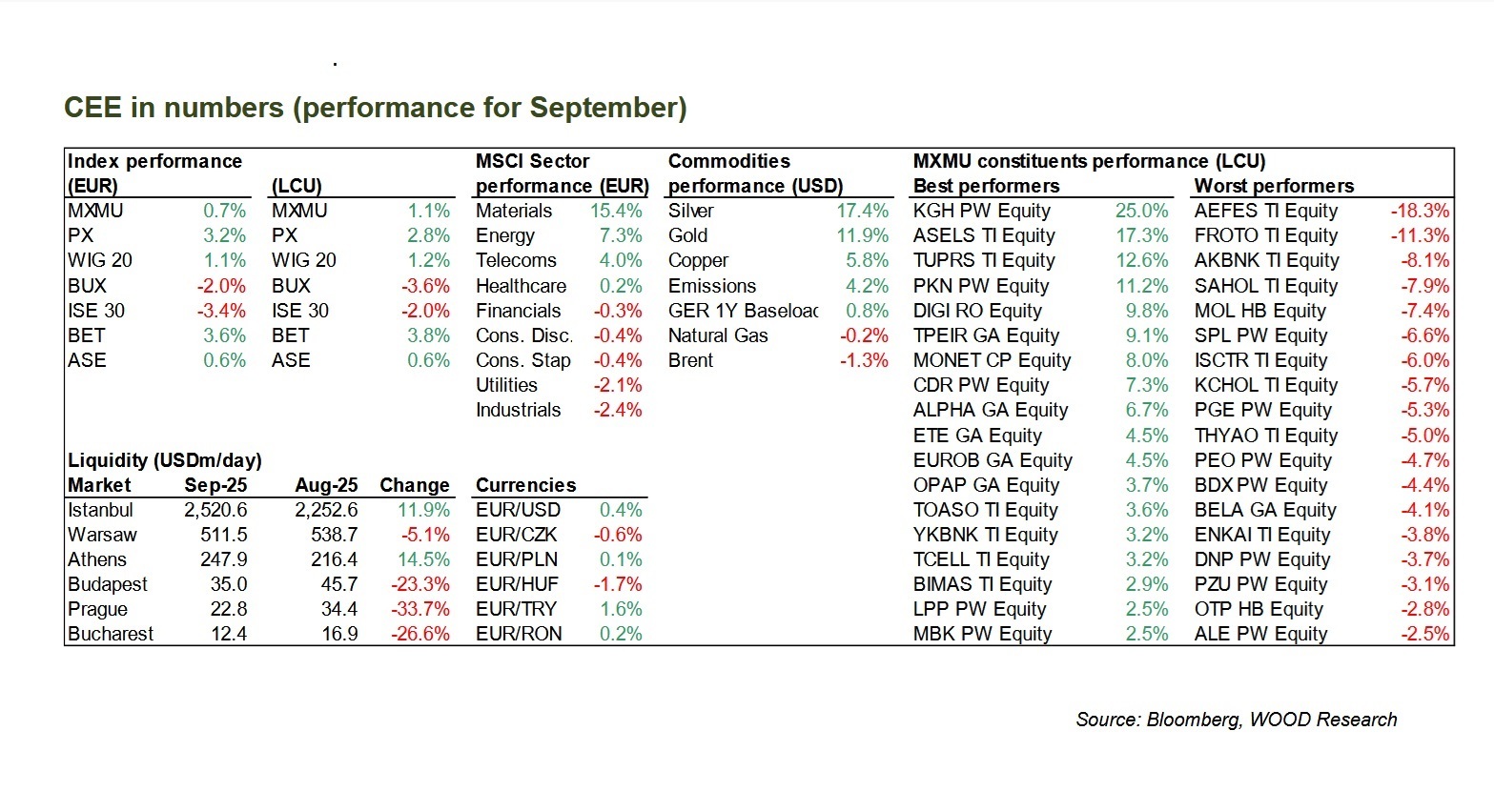 Contraperformanța a fost în Turcia, unde indicele ISE a pierdut în septembrie 3,4% și în Ungaria unde indicele BUX a suferit un recul de 2,0%.