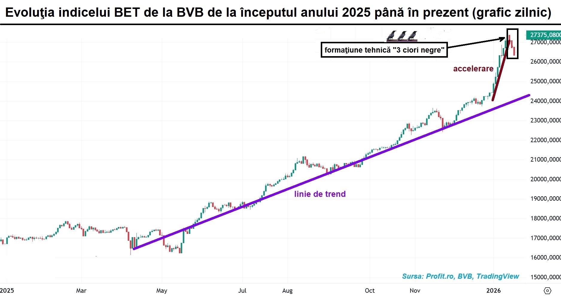 Este impulsul negativ care a fost imprimat și pe bursa românească ce, de asemenea, a escaladat noi culmi la cumpăna dintre ani. Indicele reprezentativ BET a coborât cu 1,14%, până la nivelul de 26.310,95 de puncte, fiind a 3-a sesiune consecutivă cu corecții mai mari de 1% și care pe grafic se văd ca 3 „lumânări” roșii care conturează formațiunea tehnică a celor „3 ciori negre” („3 black crows”), care are conotații negative pentru evoluția următoare a cotației.