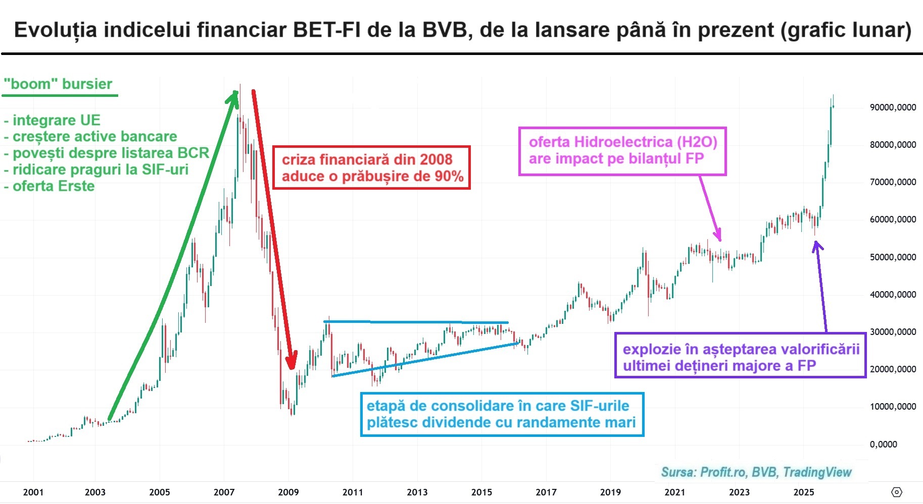 Investitorii de la BVB au renunțat să se mai uite post-criză la indicele BET-FI. În primul rând era prea dureros. Căderea la criza financiară a fost de 90% în cazul SIF-urilor, la minimul din primăvara anului 2009, sub reperul de 10.000 de puncte, și procentajul mare al acestor titluri în deținerile investitorilor de la BVB a avariat portofoliile.