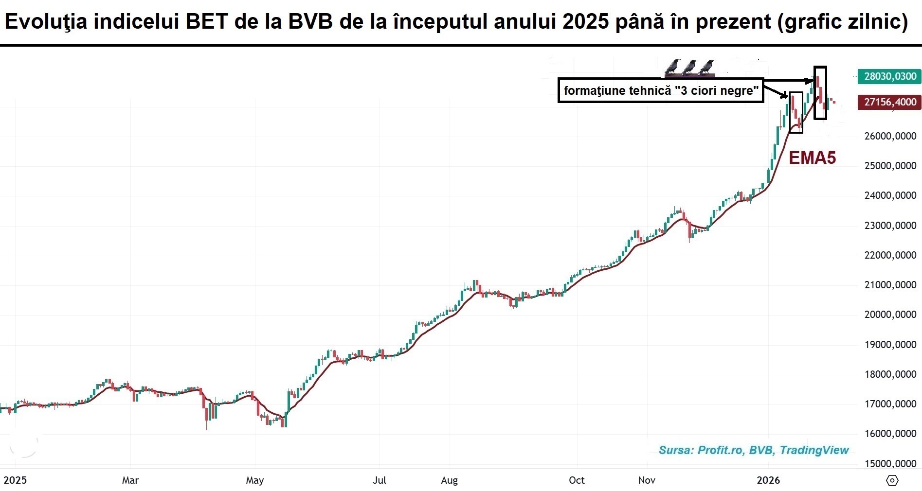 Este tabloul în care la BVB piața a schițat o ușoară retragere. Indicele compozit BET-XT a coborât cu 0,42% și indicele reprezentativ BET s-a corectat cu 0,33%, până la nivelul de 27.277,94 de puncte, într-o ezitare marcată de aparția în săptămânile precedente, de 2 ori, a formațiunii celor „3 ciori negre” care trădează o precipitare la vânzare a unor investitori.