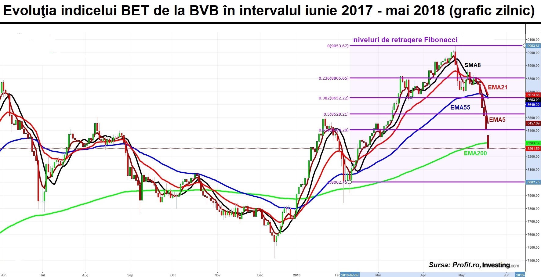 Indicele compozit BET Plus a pierdut 1,82%, iar indicele reprezentativ BET a coborât cu 1,77%, până la nivelul de 8.260,86 puncte. Important din punct de vedere tehnic, indicele a doborât și ultima retragere Fibonacci, de 61,8%, a impulsului ascendent inițiat în februarie și a trecut sub media mobilă exponențială de 200 de zile (EMA200), invalidând și cele din urmă repere care țineau piața pe o tendință pozitivă. Următorul baraj credibil este în zona de 8.000 de puncte pe indicele BET, echivalent și cu ultimul minim relevant din acest an, așa cum se vede pe graficul atașat.