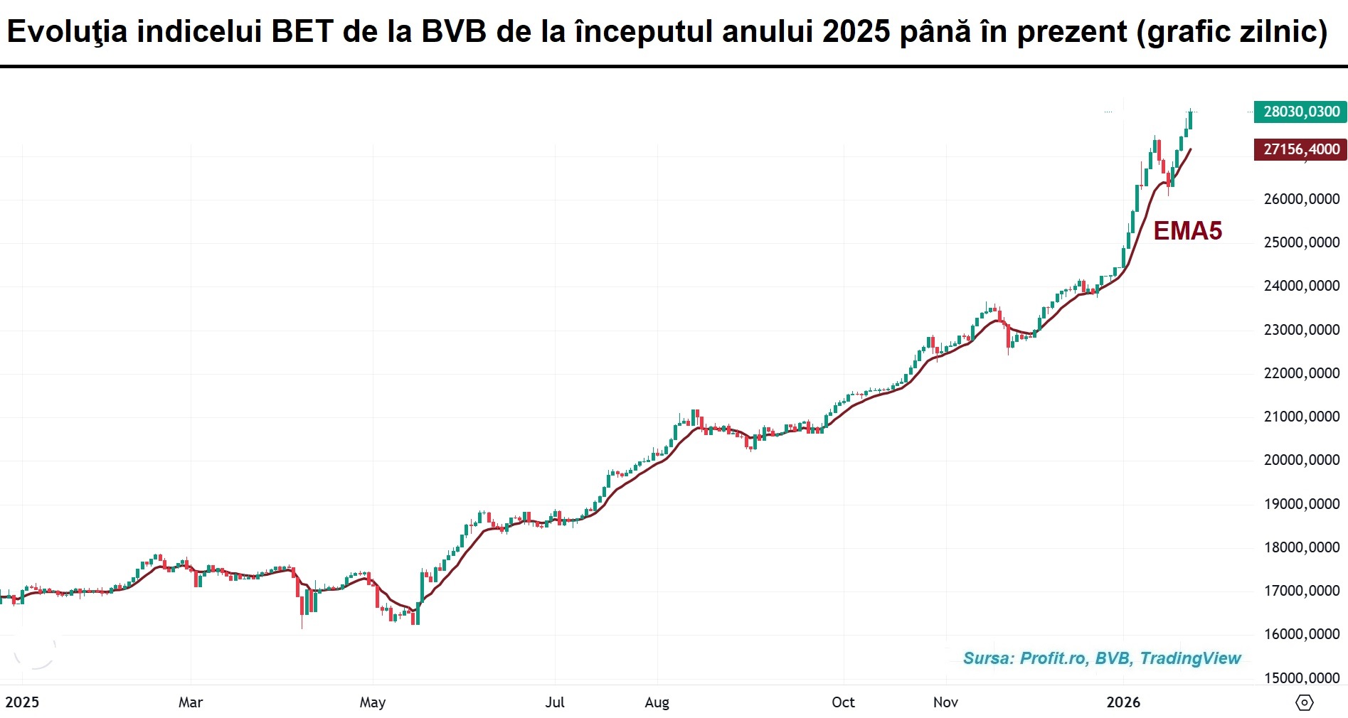 Este contextul în care investitorii de la BVB au avut curajul să împingă piața mai sus, în traiectoria sa parabolică pe care s-a înscris la cumpăna dintre ani. Indicele compozit BET-XT a câștigat 1,51% și indicele reprezentativ BET a urc at cu 1,46%, până la un nou maxim de 28.030,03 de puncte.
