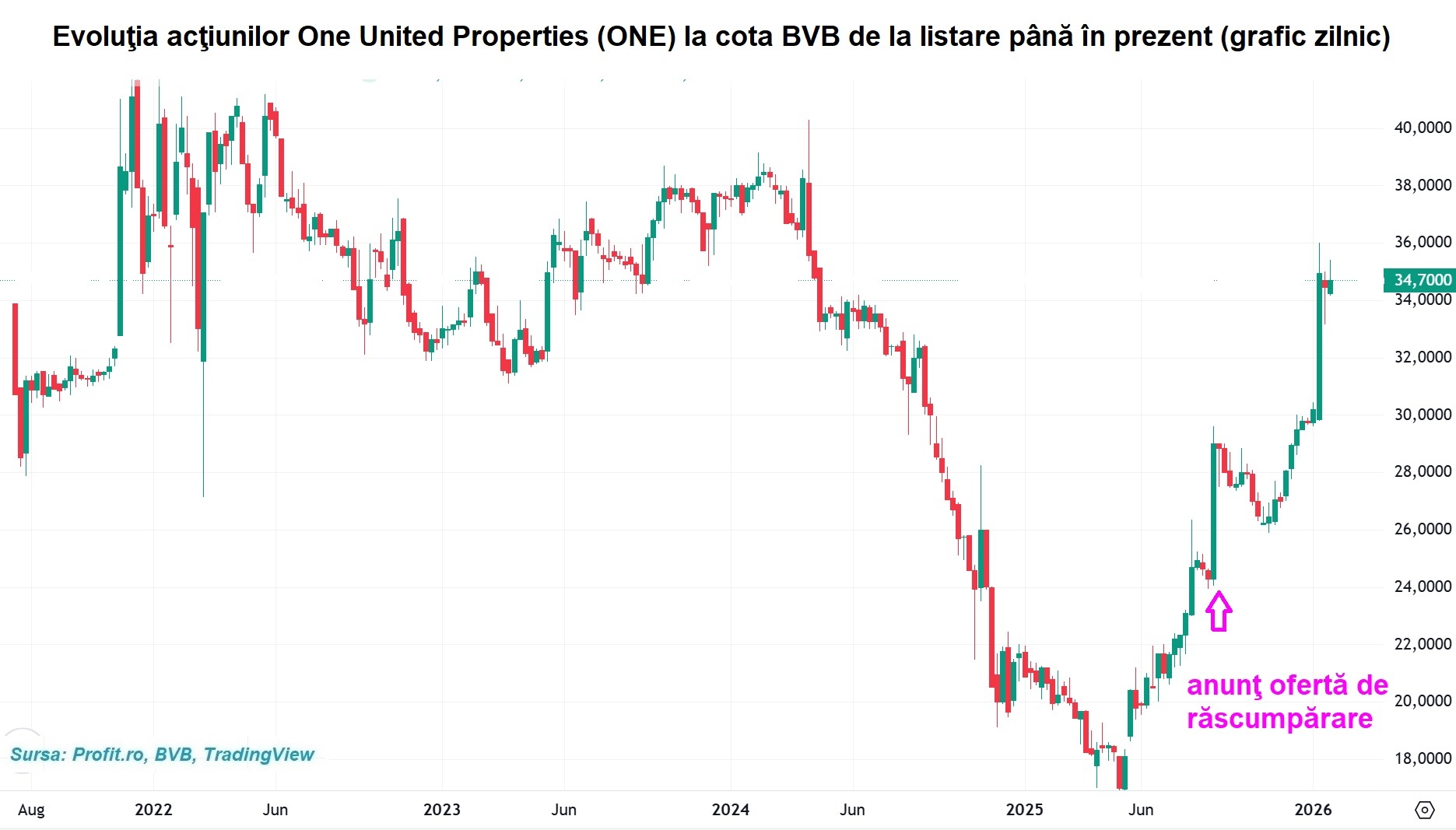 Între timp cotația s-a apreciat în piață, și pe fond al unei escaladări din maxime în maxime a indicilor locali, și ultimul preț de închidere al titlurilor cu simbolul ONE este de 34,50 lei/acțiune, cu 13,75% sub prețul maxim al operațiunii de buy-back în pregătire..