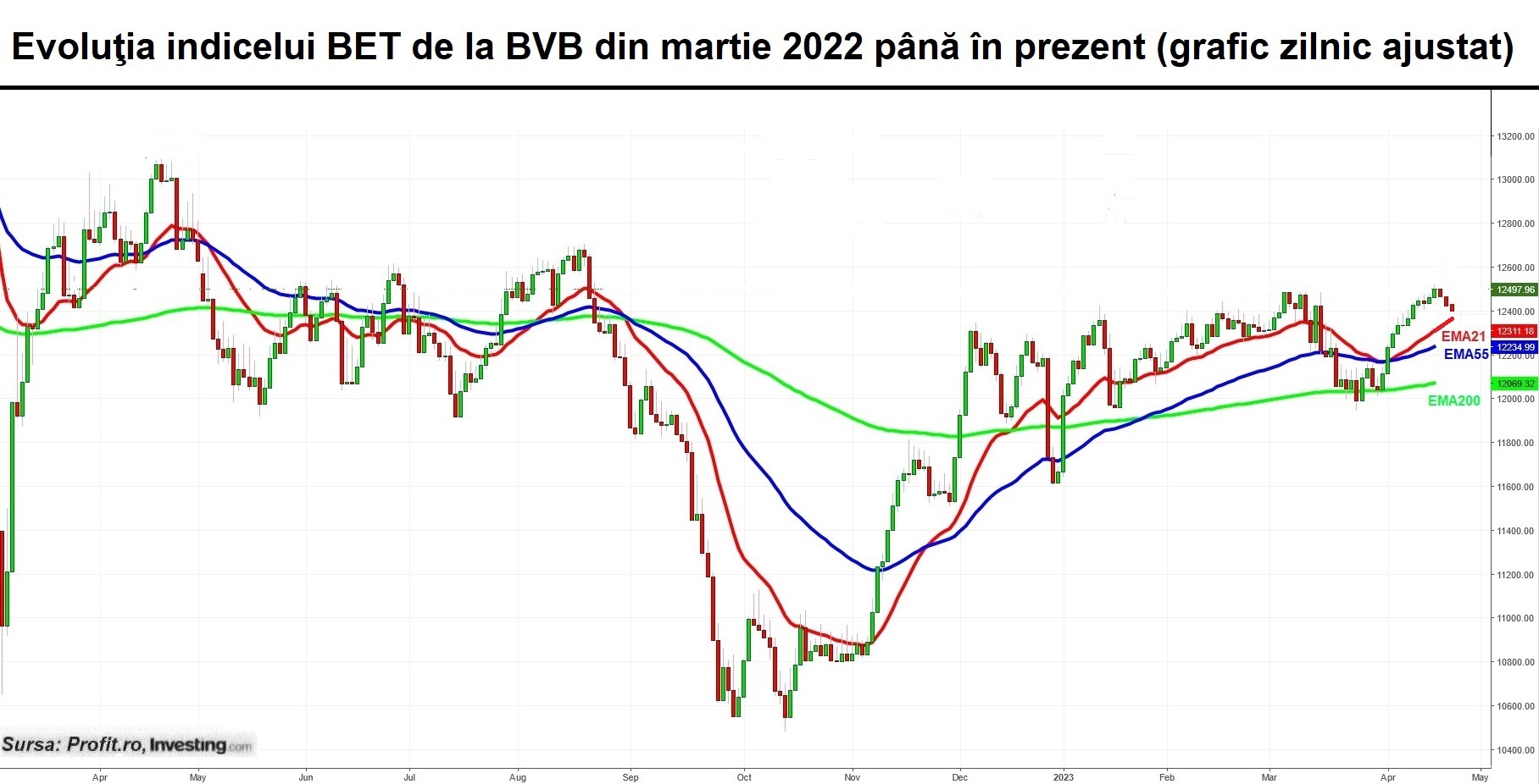 Sunt mișcări în linia cu parcursul general al pieței care arată declin pe linie la nivelul indicilor: -0,26% pentru indicele compozit BET-XT, -0,23% pentru indicele financiar BET-FI care a închis la nivelul de 50.775,79 de puncte, -0,22% pentru indicele energetic BET-NG și -0,23% pentru indicele reprezentativ BET care la nivelul de 12.396,70 de puncte s-a înscris pentru testarea mediei mobile exponențiale de 21 de zile (EMA21), așa cum se vede pe graficul atașat.
