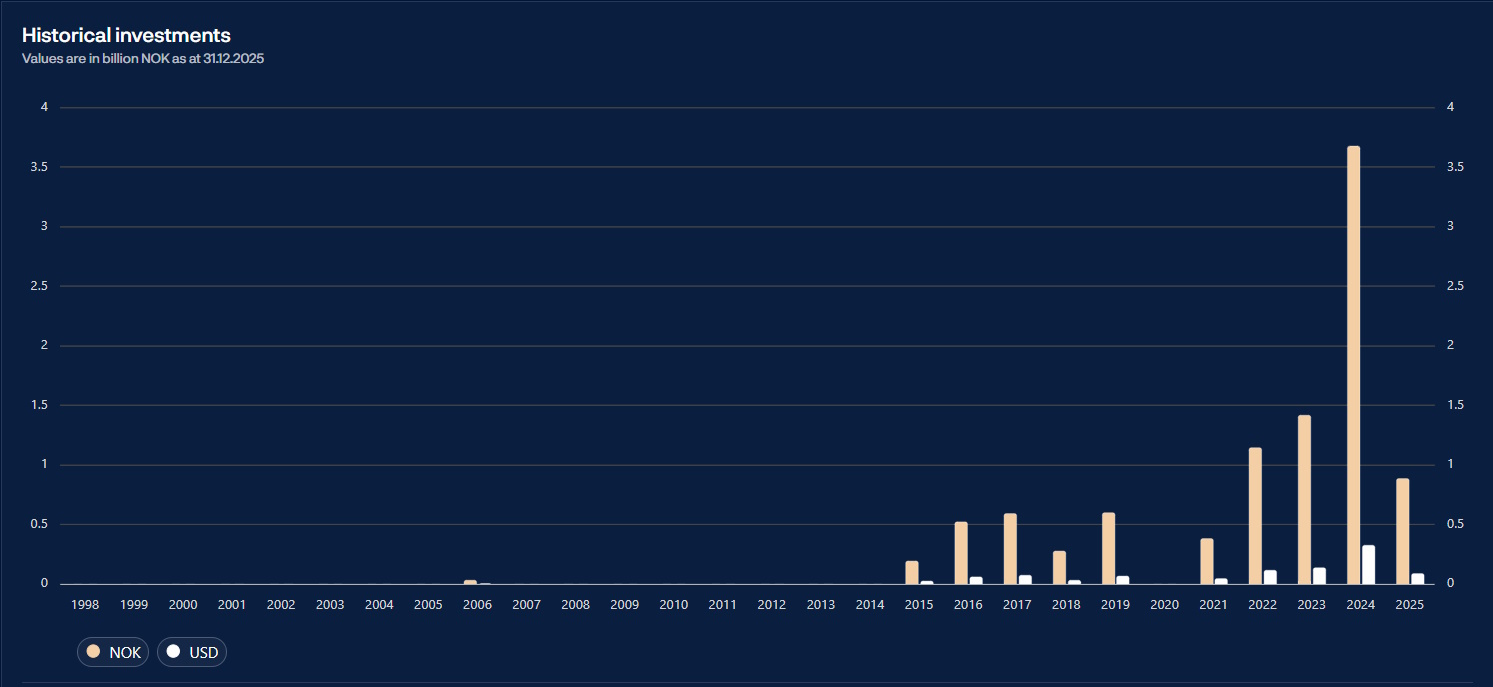Valoarea activelor fondului a crescut cu 1.526 miliarde de coroane (159,3 milioane dolari) în 2025, ajungând la 21.268 miliarde de coroane (circa 2.200 miliarde de dolari) la finele anului.
