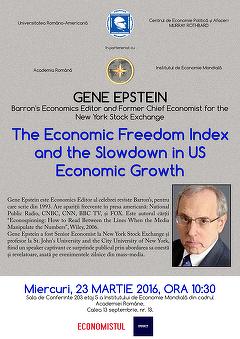 Cum poate fi explicat ritmul redus al creșterii economice a SUA din noul mileniu, de doar 1,7-1,8% pe an, comparativ cu media de 3% pe an înregistrată în ultimele 3 decenii ale mileniului trecut? Aceasta este doar una din întrebările la care va răspunde Gene Epstein, fost Senior Economist al New York Stock Exchange, într-o serie de conferințe pe care le va susține în această săptămână în București.