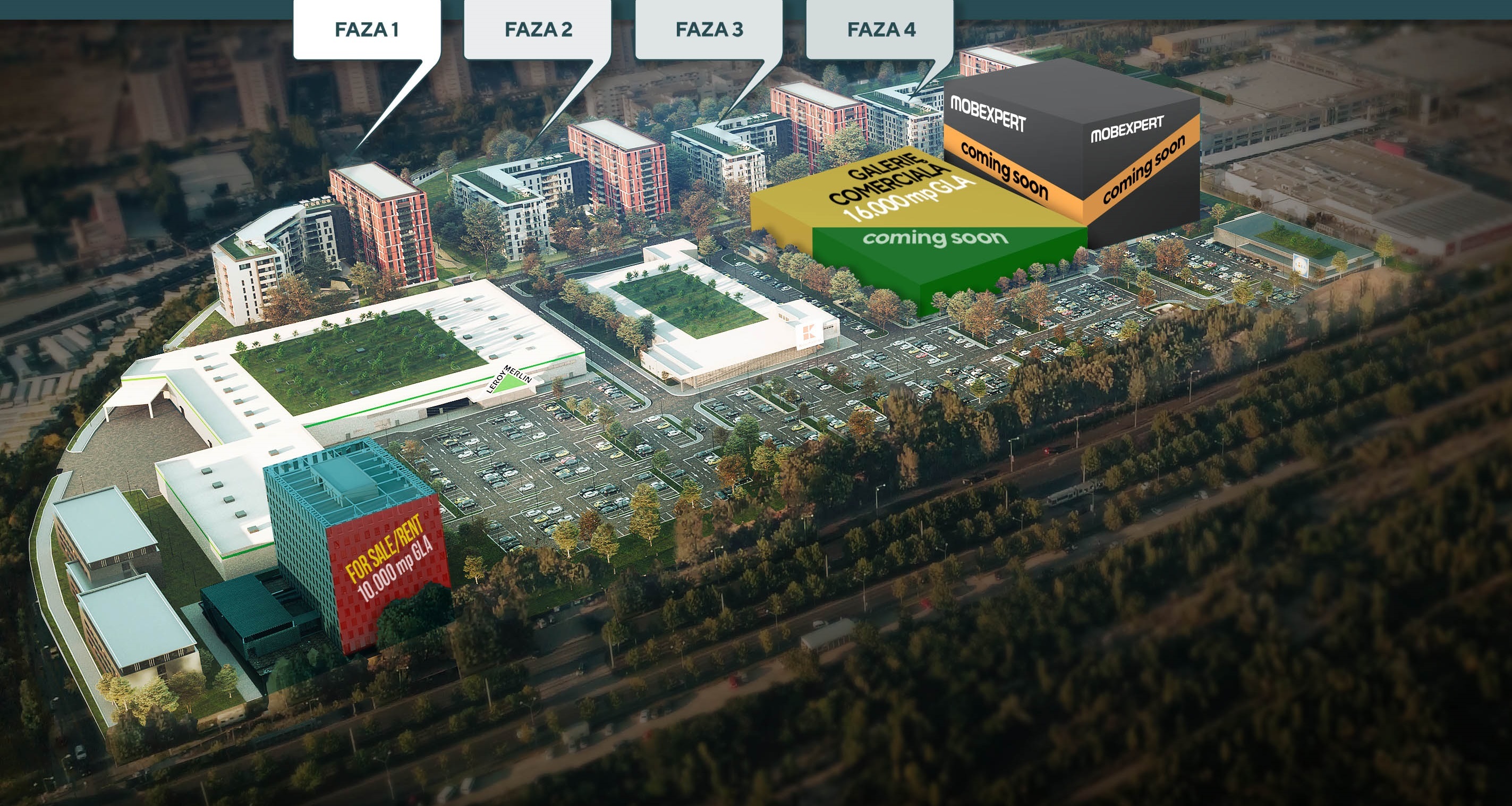 Noile planuri, însă, arată că a renunțat definitiv la cele două clădiri de birouri, în complex mai fiind programată o singură clădiră de birouri, cu o suprafață de circa 10.000 de metri pătrați, amplasată în fața magazinului Leroy Merlin și disponibilă la vânzare sau închiriere.