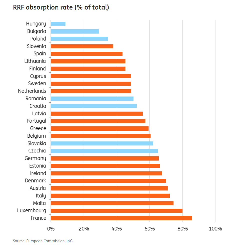 Astfel, Polonia a accelerat încasările după ce noul guvern a deblocat PNRR, în timp ce Ungaria are cele mai multe fonduri blocate, ca urmare a disputelor cu UE privind statul de drept și care probabil vor constitui un subiect important în alegerile de anul viitor, notează ING.