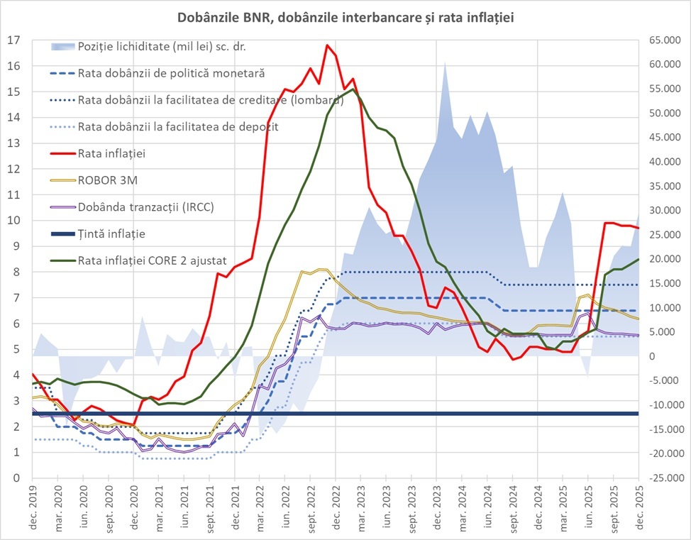 Inflația de bază, indicator urmărit îndeaproape de banca centrală, a urcat de la 5,7% în vară la 8,5% la finele lui 2025. Atât inflația headline, cât și cea de bază s-au plasat peste estimările BNR din noiembrie de 9,6%, respectiv 8,1%.