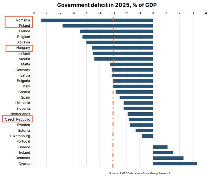 Cehia a încheiat 2025 cu un deficit de sub 2% din PIB și estimarea CE arată un nivel similar în acest an și o creștere la 2,2% în 2027. Datoria publică a fost de circa 43% din PIB la finele anului trecut, și este proiectată să atingă 45% la finele lui 2027.