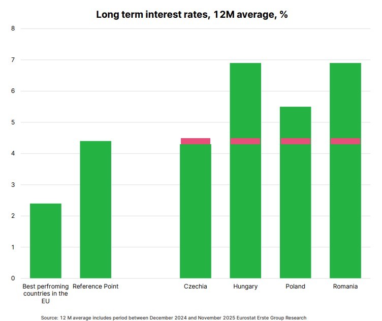 România și Ungaria au cele mai ridicate dobânzi pe termen lung, cu o medie de aproape 7% în ultimele 12 luni, față de 5,5% în Polonia și 4,5% în Cehia, nivel care este și cel de referință în criteriile Maastricht la acest moment, adică 2 puncte procentuale peste media celor mai performante țări.