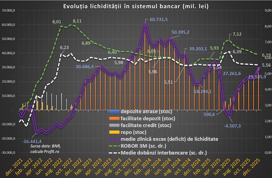 Băncile comerciale au înregistrat un excedent mediu zilnic al lichidității în raport cu banca centrală de 29,5 miliarde de lei în decembrie, în creștere de la 22,5 miliarde de lei în noiembrie, stabilind astfel cel mai ridicat nivel de după aprilie 2024.