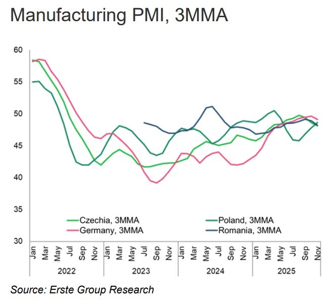 În regiune, indicele PMI a crescut în Ungaria(+2,2), Cehia (+0,8) și Polonia (+0,3), însă în cazul ultimelor două rămâne sub nivelul de 50 de puncte, la 48 de puncte, respectiv 49,1 puncte, în timp ce în Ungaria nivelul a ajuns la 53,4 puncte.