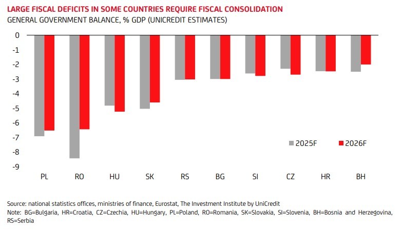 România se remarcă și în acest an prin cel mai ridicat deficit bugetar, estimat la 8,5% din PIB de UniCredit, față de 9,3% în 2024. Pentru 2026, analiștii băncii italiene văd o scădere a deficitului la 6,4% din PIB, peste nivelul de 6% menționat de premierul Ilie Bolojan.