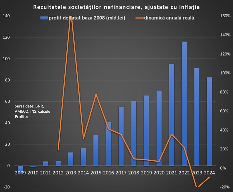 Ajustate cu inflația ridicată, datele sunt chiar mai proaste în ultimii doi ani. Profitul net este în scădere cu 10% față de 2023 și cu 29% față de 2022, fiind inclusiv sub nivelul din 2021, dar cu circa 18% peste nivelul din anul de pandemie 2020.