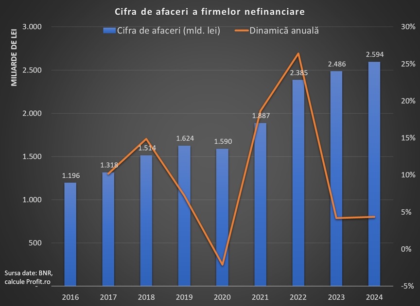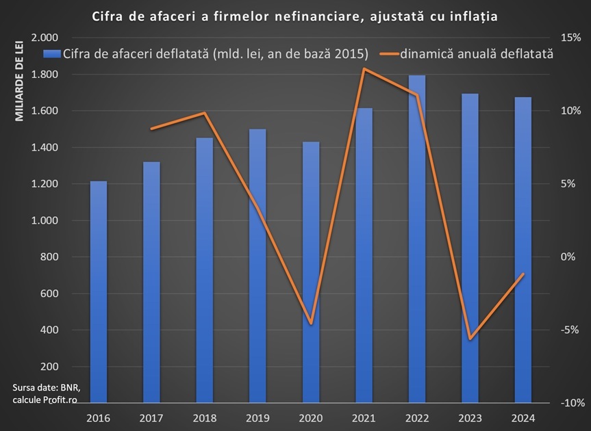 Cifra de afaceri a firmelor nefinanciare a atins anul trecut aproape 2.600 de miliarde de lei sau 521 de miliarde de euro, față de sub 2.400 de miliarde de lei sau 484 de miliarde de euro în 2022. Ajustat cu inflația, vânzările firmelor au scăzut cu circa 7% față de 2022, cu o contracție de 5,6% în 2023 și una de 1,2% în 2024.