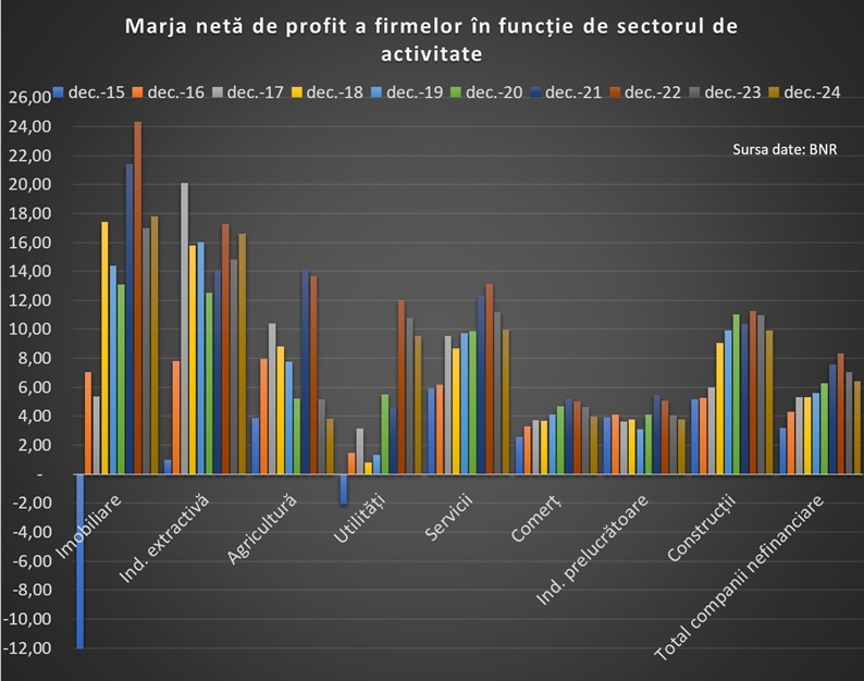 Anul trecut a crescut marja în imobiliare (+0,8 pp) la 17,8%, care este și cea mai ridicată, și în industria extractivă (+1,8 pp), la 16,6%.