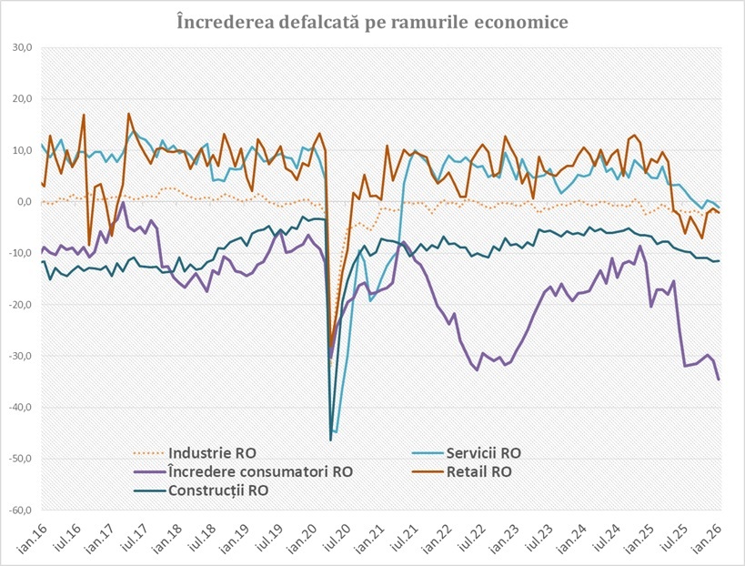 În cazul consumatorilor, indicele a scăzut cu 3,7 puncte față de decembrie, și la -34,6 puncte este la cel mai redus nivel de după perioada 2010-2011, când se simțea efectul măsurilor de austeritate: creșteri de taxe și scăderea salariilor bugetarilor. Un nivel atât de scăzut nu a fost atins nici măcar în pandemie.