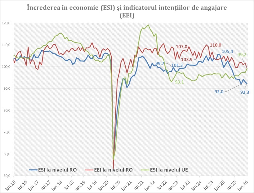 Indicele de încredere în economie (Economic Sentiment Indicator – ESI) a scăzut la 92,3 puncte în ianuarie, față de 93,1 puncte în decembrie.