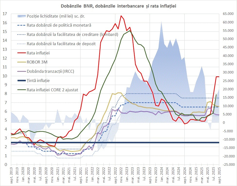 Ultima prognoză a BNR (din august) arăta inflația la 9,2% în septembrie și 8,8% finele anului, însă aceasta va fi revizuită cel mai probabil în sus cu ocazia noului raport din noiembrie.