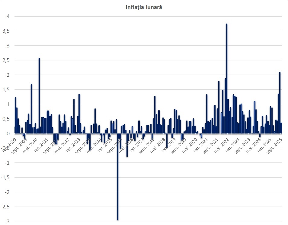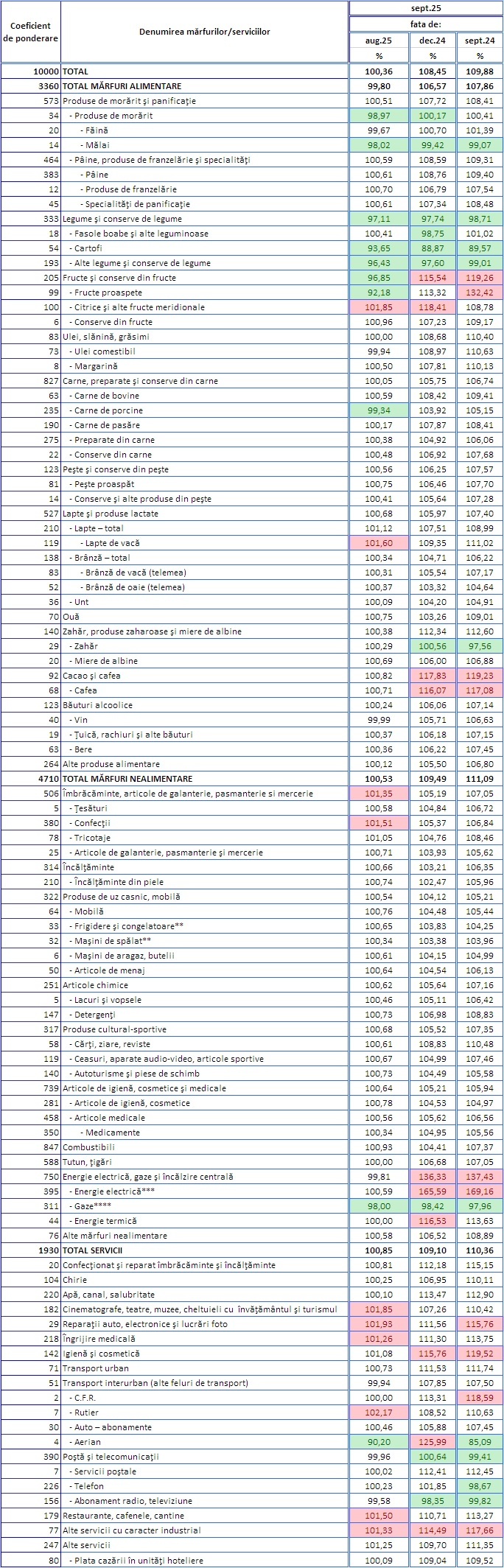 S-au scumpit în schimb cu cele mai mari rate față de septembrie 2024: fructele (+19,3%), cafeaua (+17,1%), energia electrică (+69,2%!!!), serviciile de igienă și cosmetică (+19,5%), transportul cu trenul (+18,6%).